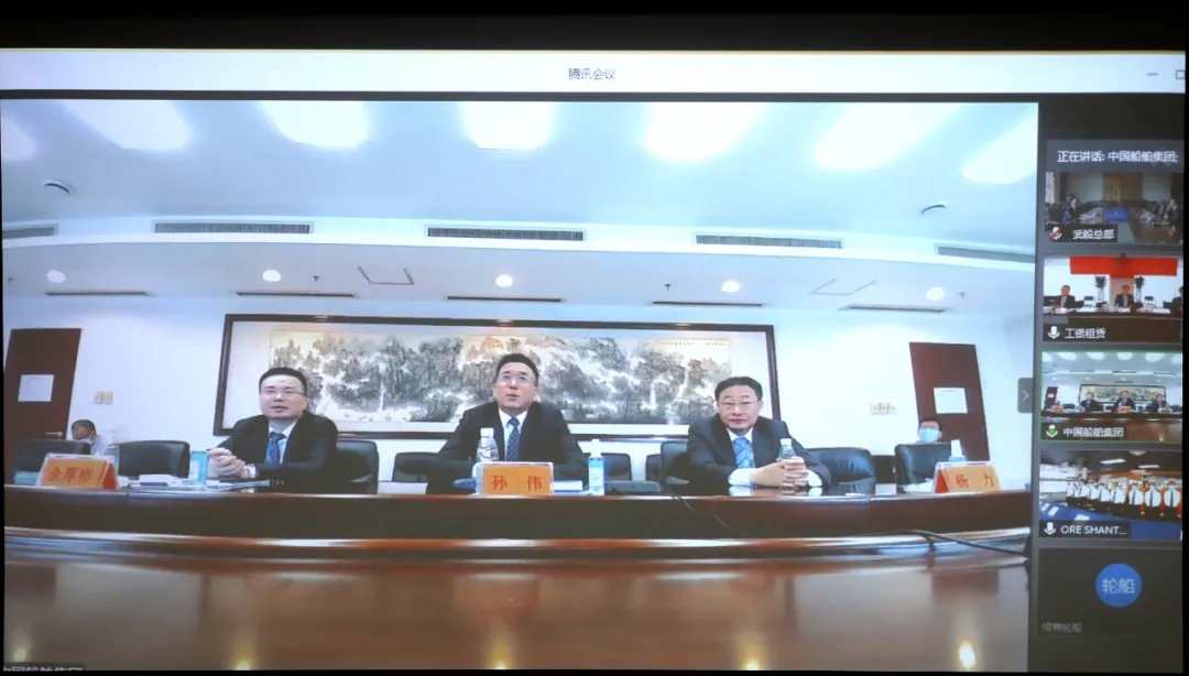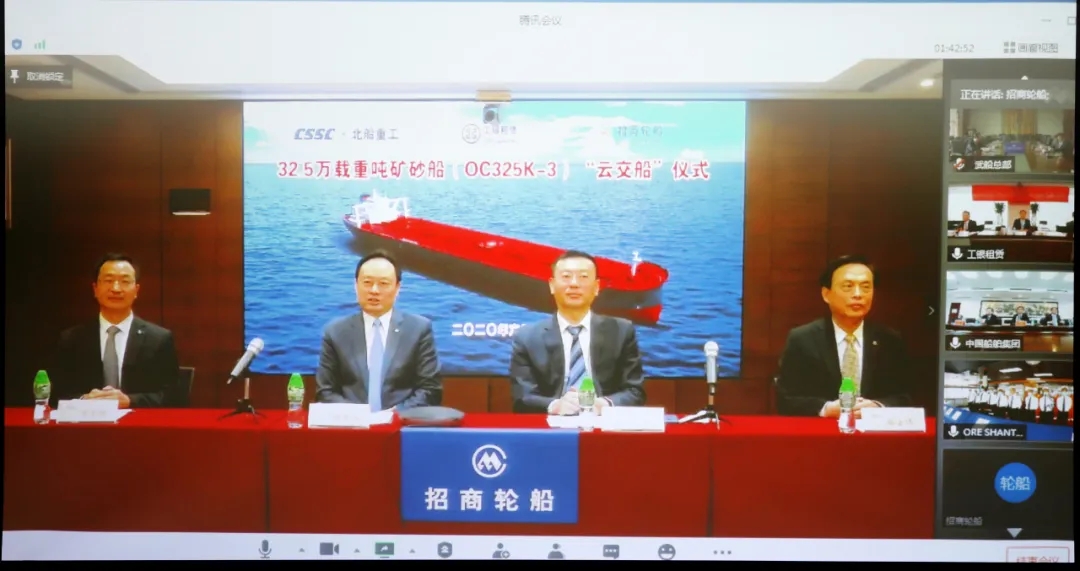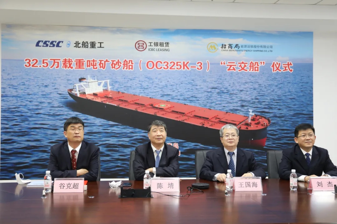 本次“云交船”儀式在北京、香港、武漢、青島4城5地同步舉辦,中國船舶集團副總經理孫偉、招商輪船董事長謝春林、工銀租賃總裁趙桂才、武船集團董事長陳?較群籩麓牽?工銀租賃航運金融事業部執行總經理郭芳萌、武船集團北船重工總經理谷克超代表雙方簽署了交船議定書,武船集團北船重工董事長王國海主持儀式。