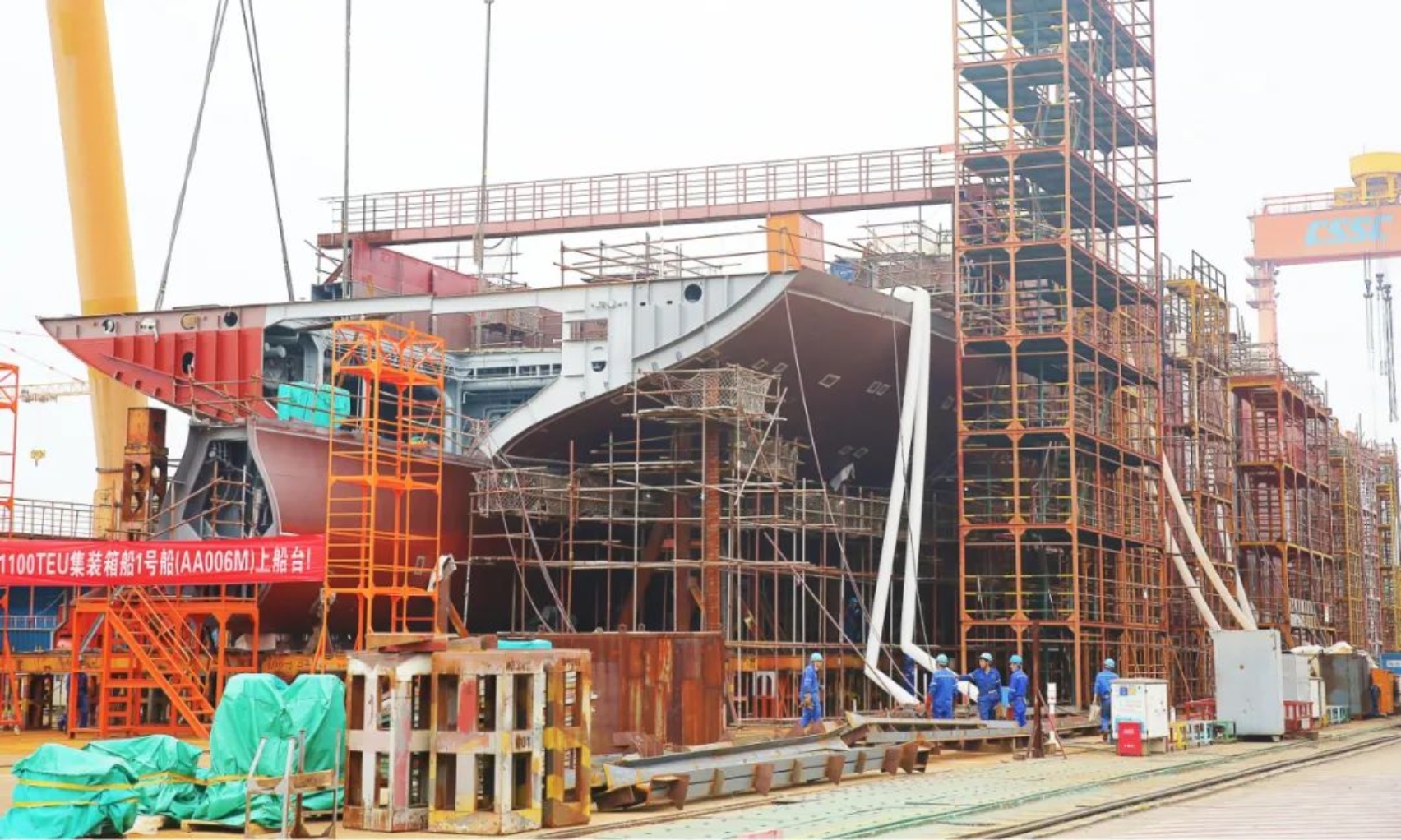 5月16日上午11時(shí)18分,武昌造船為CA Shipping建造的1100TEU集裝箱1號船在雙柳廠區(qū)順利上船臺,在船舶完整性良好的前提下實(shí)現(xiàn)計(jì)劃節(jié)點(diǎn)提前9天完成。